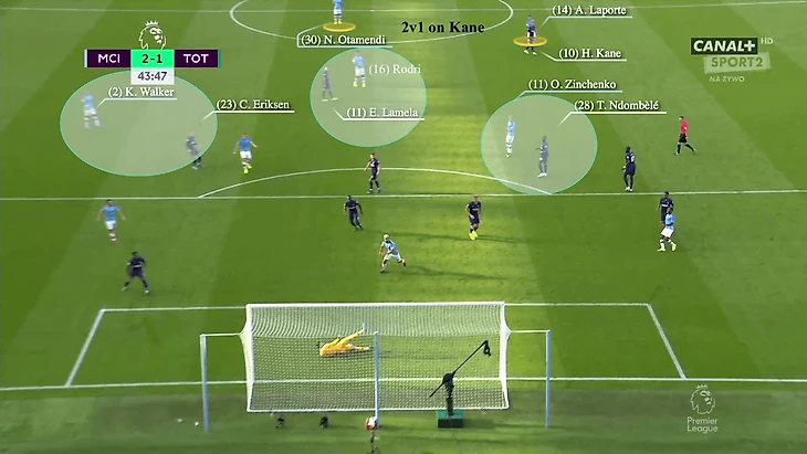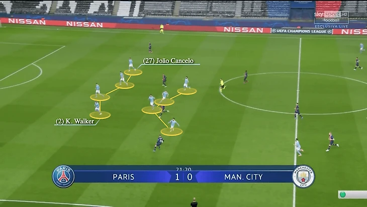 Обратите внимание на то, как Жоау Канселу и Кайл Уокер подстроились, оставив место на фланге, но сократив расстояние между собой и центральными защитниками.