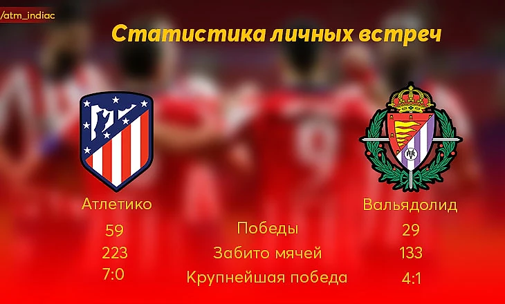 Последний раз "Атлетико" проигрывал в матчах с "Вальядолидом" еще в 2008 году, задолго до Диего Симеоне, в основном, аутсайдер не добывает и ничьей, последнее очко для "Вальядолида" в матчах с "Атлетико" датировано 2019 годом. До этого "Атлетико" выиграл 8 личных встреч с "Вальядолидом".