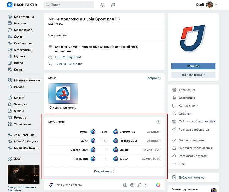Ваша лига теперь в Вконтакте! И не в качестве рядового сообщества, группы, а как спортивно-статистическое приложение. Теперь любая лига или федерация, имеющая сайт на платформе Join Sport, может быстро и просто активировать свое собственное мини-приложение (VK Mini Apps*) и предложить его своим подписчикам. Календарь игр, турнирные таблицы, игровая статистика, протоколы матчей, составы и многое другое - прямо в ВК.