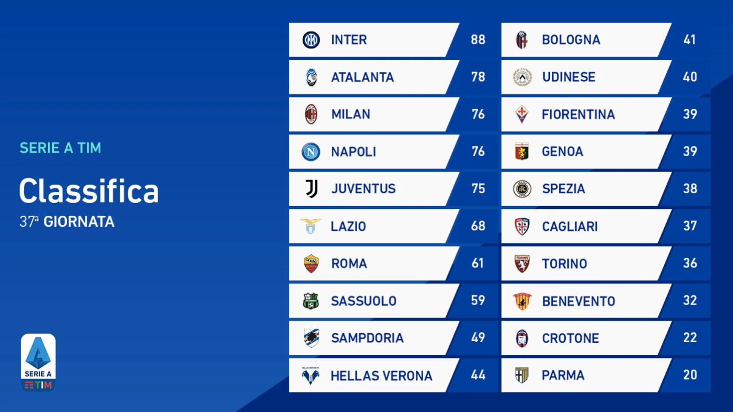 Так выглядит турнирная таблица Серии А перед заключительным туром: