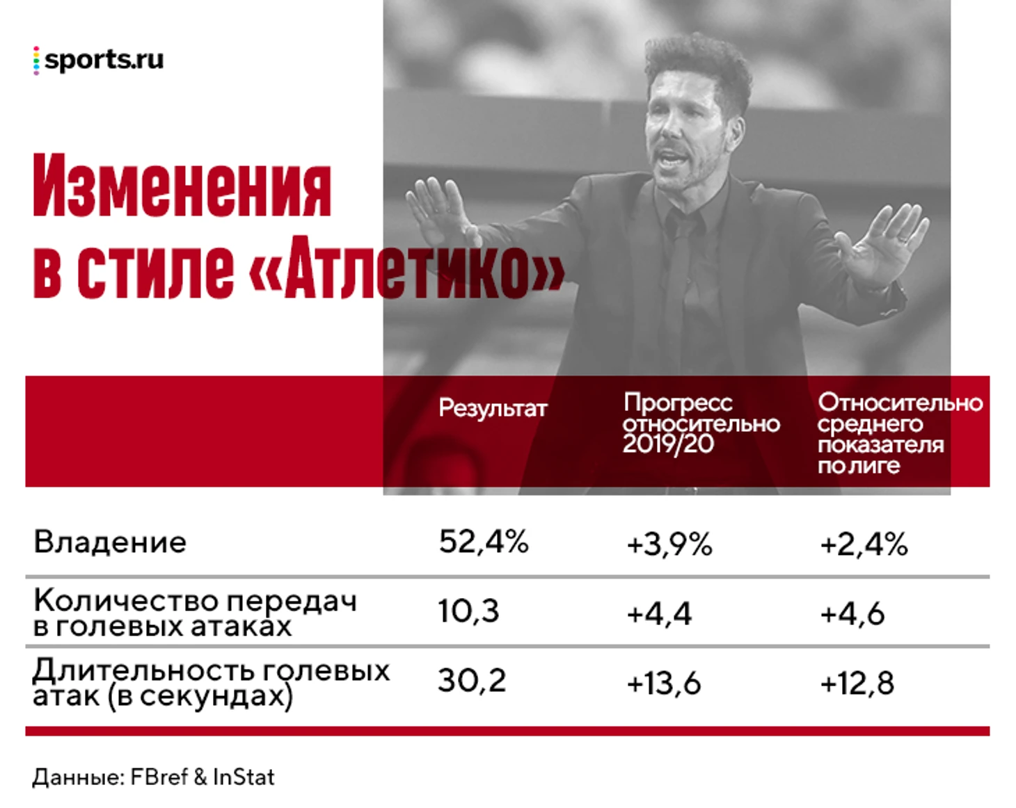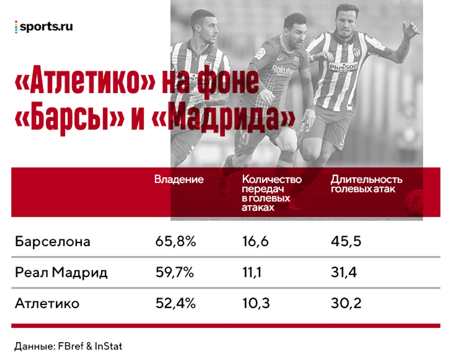 С одной стороны, стилистическая разница между «Атлетико» и другими грандами все еще значительная. С другой, раньше команда Симеоне была вообще на другом полюсе и совсем иначе строила атаки и забивала голы. Они не были третьими по длительности голевых атак и количеству передач в них. Теперь стали явно третьей командой после «Барсы» и «Реала».