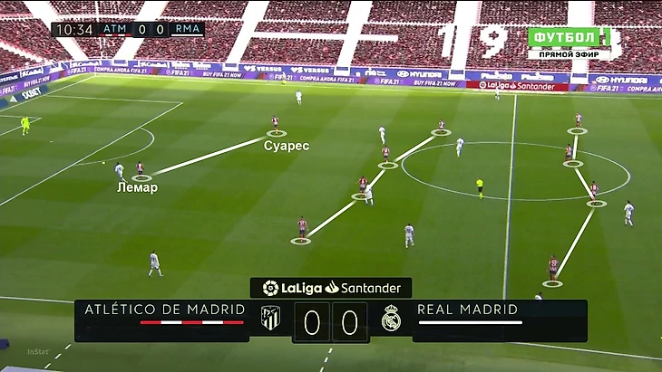 Лучше всех в роли такого партнера Луиса по давлению выступал Анхель Корреа. С ним «Атлетико» особенно качественно душит оппонентов. Но вообще замысел предполагает эпизодичность прессинга. Если Суарес устал или нет поддержки, или ситуация в матче не побуждает к этому, «Атлетико» может без проблем откатиться в средний или низкий блок. Но если давление пошло, то оно почти всегда цельное и организованное.