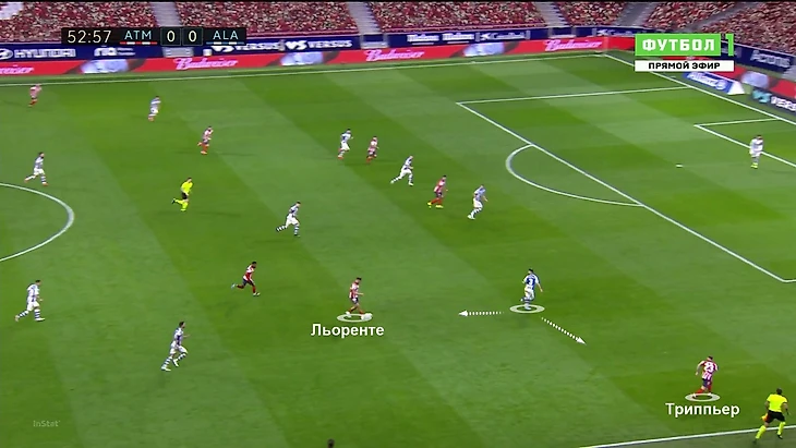 Справа работает совсем другая динамика. Триппьер и Льоренте перегружают эту зону. Больше всего трудностей соперникам создают резкие рывки Льоренте из центра на правый край. Дальше есть два сценария.