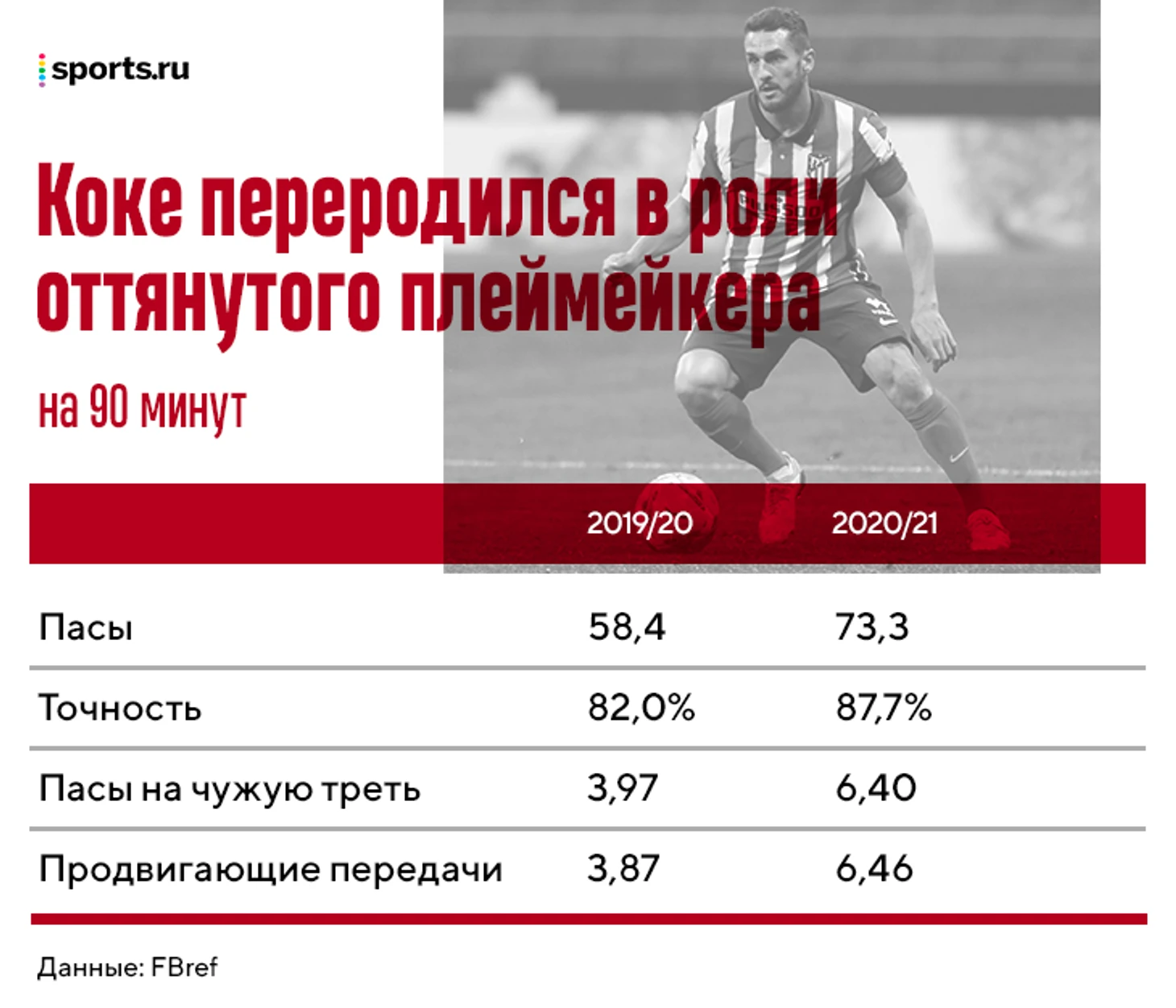 Коке дает этой команде баланс. Об этом детально рассказал The Athletic источник из раздевалки «Атлетико»: «Щедрость Коке по отношению к партнерам иногда отвлекает от осознания того, насколько блестяще он играет. Коке понимает футбол на уровне, который доступен очень немногим. Он идеально видит все происходящее на поле. Он – человек, который пытается замечать и устранять все малейшие проявления дисбаланса. Он держит в голове всю картину, пробегает по 13 км за матч и постоянно адаптируется так, чтобы дать команде тактический баланс».