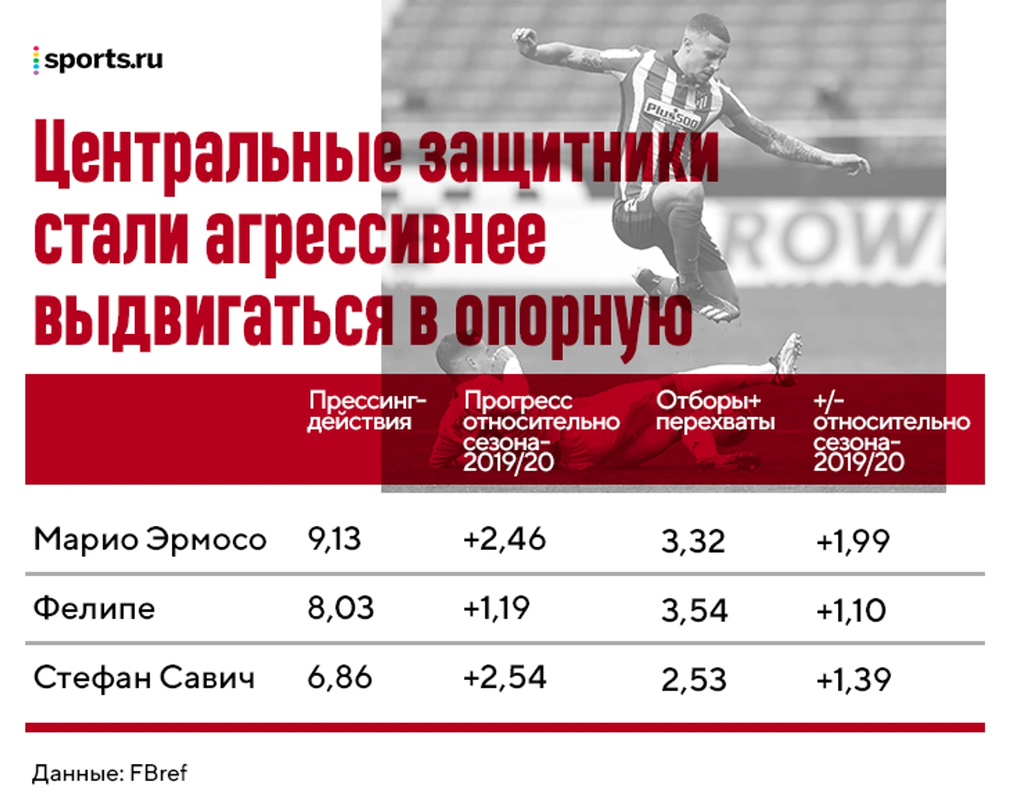 В таблице показана разница в количестве прессинг-действий и оборонительных действий у защитников «Атлетико». Их стало намного больше. Это говорит не об уровне игры, а о манере. Раньше они оборонялись внутри штрафной, поэтому выжидали и не форсировали эти действия. Сейчас они поочередно выдвигаются для помощи в опорной. Отсюда и изменения в цифрах.