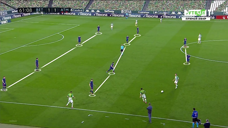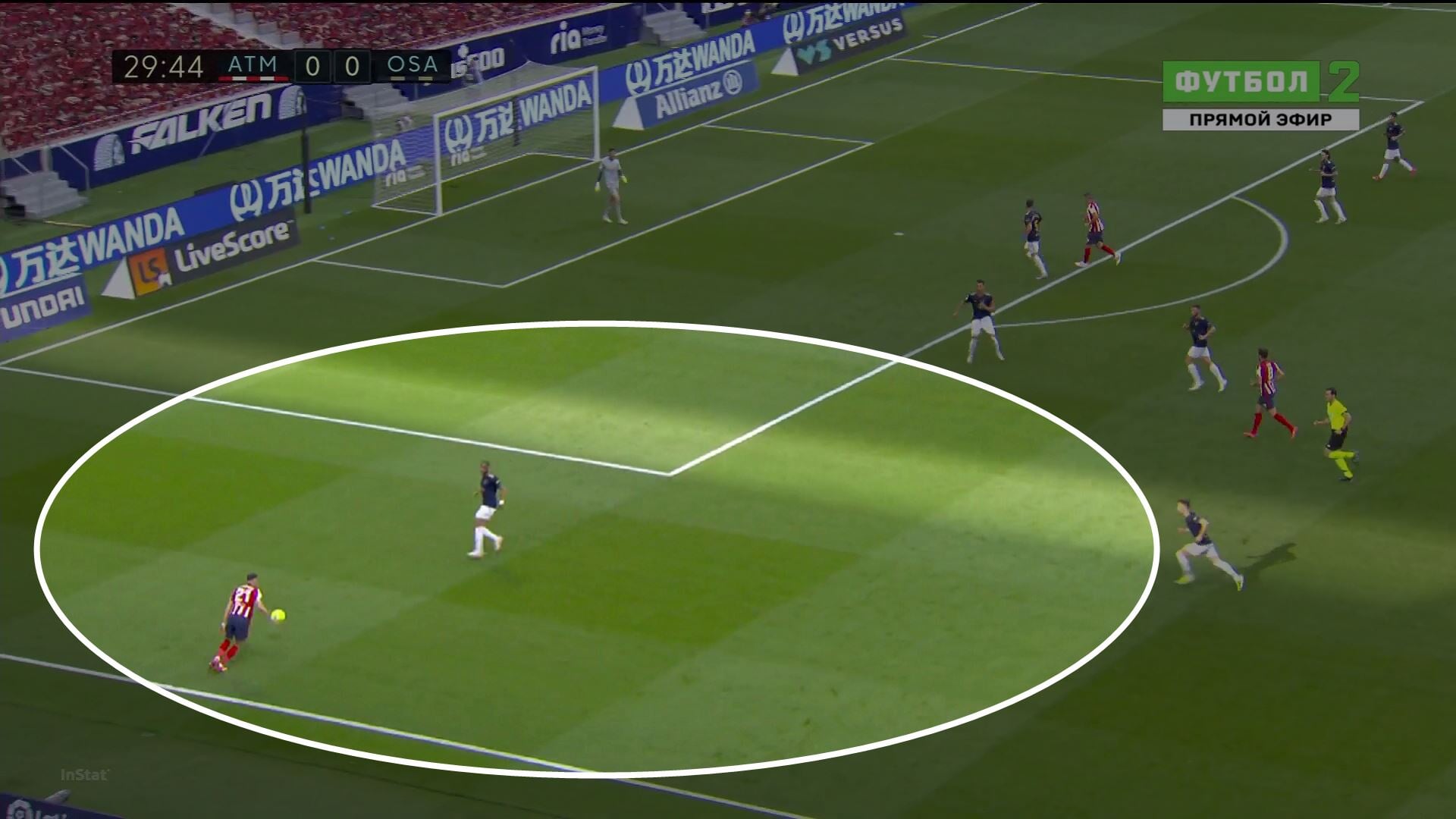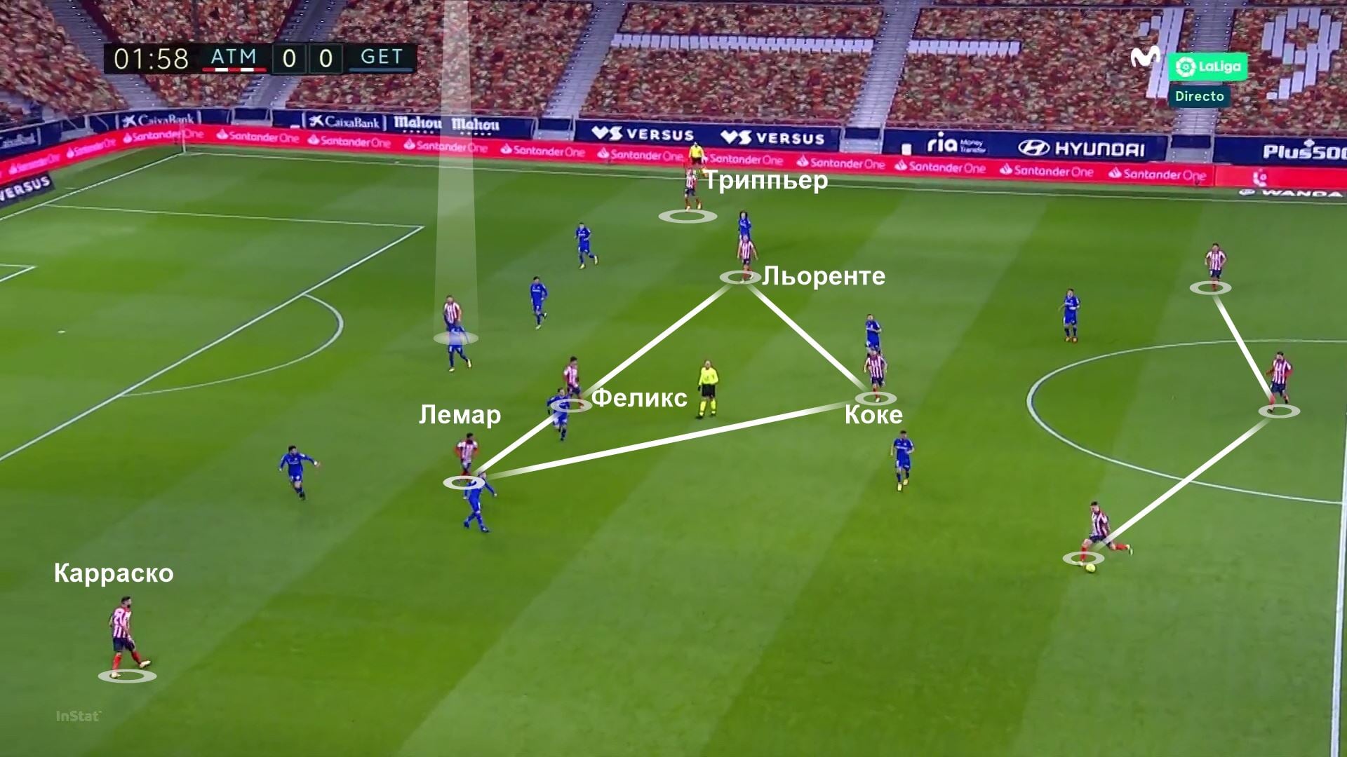 Именно поэтому мяч ему часто доставляют через переводы (пока соперник не успел сместиться в эту зону), а потенциальный партнер Карраско по флангу Марио Эрмосо остается в тройке центральных защитников, продвигает мяч, выманивает на себя оппонента, а не поддерживает атаку прямо по флангу.