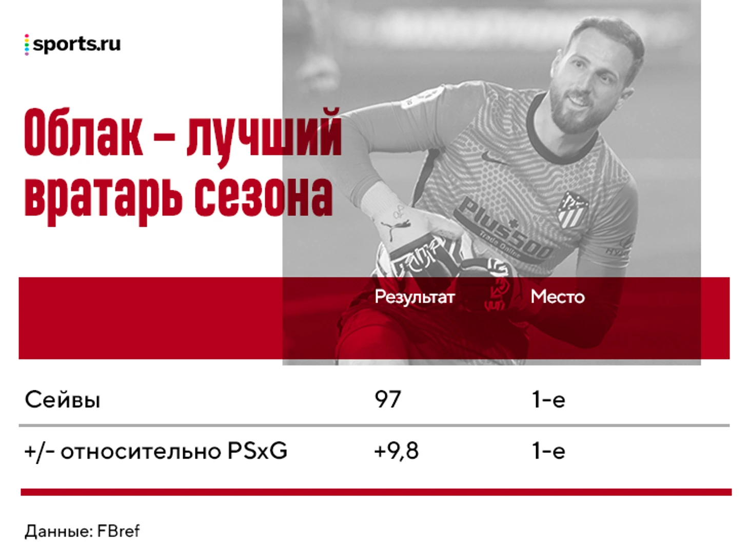 Например, он сделал больше всех сейвов в Ла Лиге – 97 штук. Обычно мы смотрим на более продвинутые метрики, потому что вратари больших клубов не получают столько шансов себя проявлять, но Облак тащил буквально все, поэтому выиграл даже общий зачет, хотя были те, кому били намного чаще.