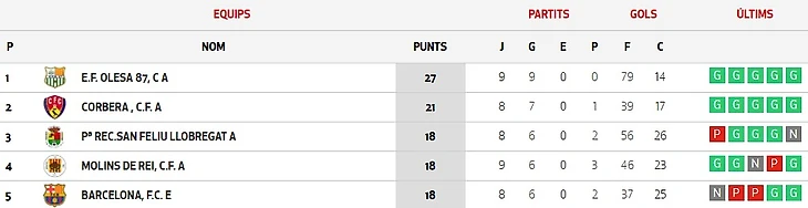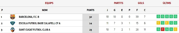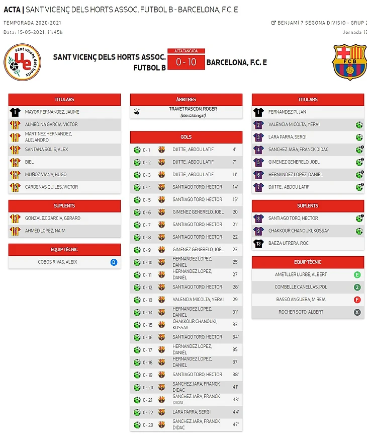 В официальном твиттер-аккаунте клубной академии «потеряли» итоги матча «Сан-Висенс» - «Пре-бенжамин», заявленный в списке игр выходных. На официальном сайте Федерации Каталонского Футбола матч есть, но «оборван» он на 0-10 (и записан в результатах тура соответствующим образом), итоговый же счет этого матча - 0-23. С 20-ой по 38-ую минуты команда забила 14 голов в ворота соперников. Даже в турнирную таблицу разница голов внесена как 10-0.