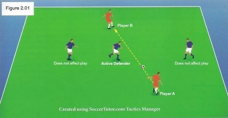 Если мы рассмотрим значение каждой главной идеи, мы получим разные взгляды на игру и на разработку игровых моделей. Как точно Брендан Роджерс рассчитал свою статистику зависит от того, как он количественно оценил оценил “доминирование с мячом”. Возможно, он ссылается на особые зоны поля. Наиболее вероятно, что идея “доминировать с мячом” специфична для каждой команды и её игроков. Для “Суонси” этими игроками, возможно, были Леон Бриттон, Нейтон Дайер и Скотт Синклер, следовательно доминировать в игре для Суонси, значит доминировать с мячом через зоны этих игроков этими игроками. С другой стороны, Ливерпуль будет доминировать через зоны Суареса, Старриджа и Коутиньо этими ключевыми игроками. Получаются разные типы доминирования, каждый из которых соответствует сильным сторонам команды. Только те люди, кто помогал разрабатывать формулу Роджерсу, знают, что значит “доминировать с мячом”. Благодаря моему опыту работы со стратегическим планированием в штабе Магнуса Перссона в сборной Эстонии, я знаю, что доминировать с мячом против Словении и доминировать с мячом против Сан-Марино, Финляндии и Исландии - разные вещи. Для полного полного понимания Главной Идеи 3.0, мы вернемся к ней позже, потому что без понимания принципов Луи Ван Гала (похожих в некоторых местах на принципы Марсело Бьелсы) объяснение бессмысленно. Без плана Философии, главная идея Марсело Бьелсы кажется также размашистой и бессмысленной. “Футбол - это игра двух против одного”, - вновь сказал Айртон, чтобы утвердить его главную идею, после дискуссии о том, что футбол - игра одного против одного. Именно так считает Роберто Мартинес и многие другие тренеры. “Посмотри на ситуацию два против трех (Figure 2.01), это все равно два против одного”, - Айртон углубился в детали и объяснил, что только один один игрок из трех активен (Active Defender), и цель игрока A (Player A) передать мяч игроку B (Player B), проникнуть, думать “вертикально”.