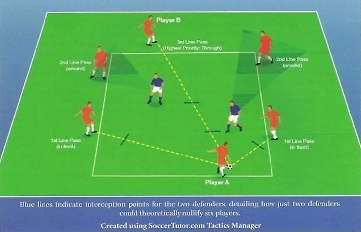 (синие линии показывают места перехватов защитников, таким образом, всего два защитника теоретически могут уничтожить шестерых нападающих)