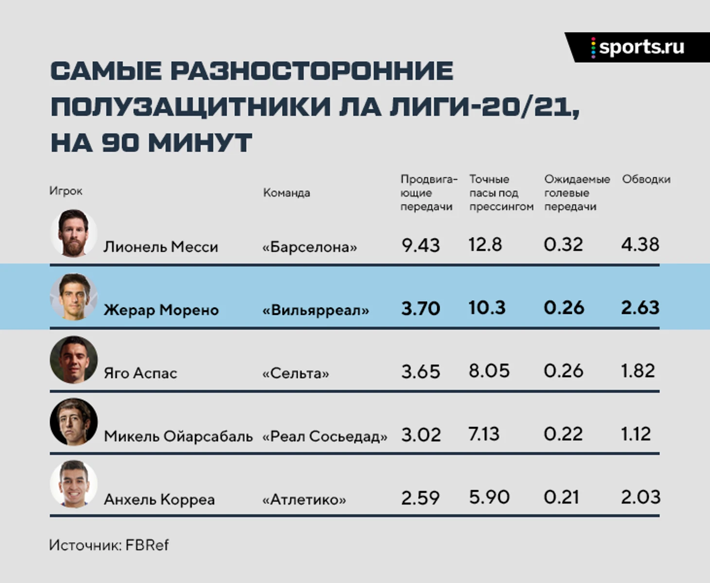 Совместная работа помогла Морено стать самым важным игроком системы Унаи: в этом сезоне он поучаствовал в 50% голов команды (лучший результат в Ла Лиге наравне с Аспасом) и создал больше всех моментов в «Вильярреале» за счет топовой техники и понимания игры. «Морено в топ-форме. Нам нужно ловить этот момент и добиваться результата», – отмечал Дани Парехо.