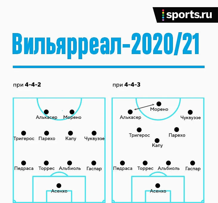С помощью перехода на 4-3-3 «Вильярреал» больше насыщает центр поля, а при 4-4-2 – фланги, так как Морено и Алькасер постоянно в движении. Схема часто зависит от соперника.