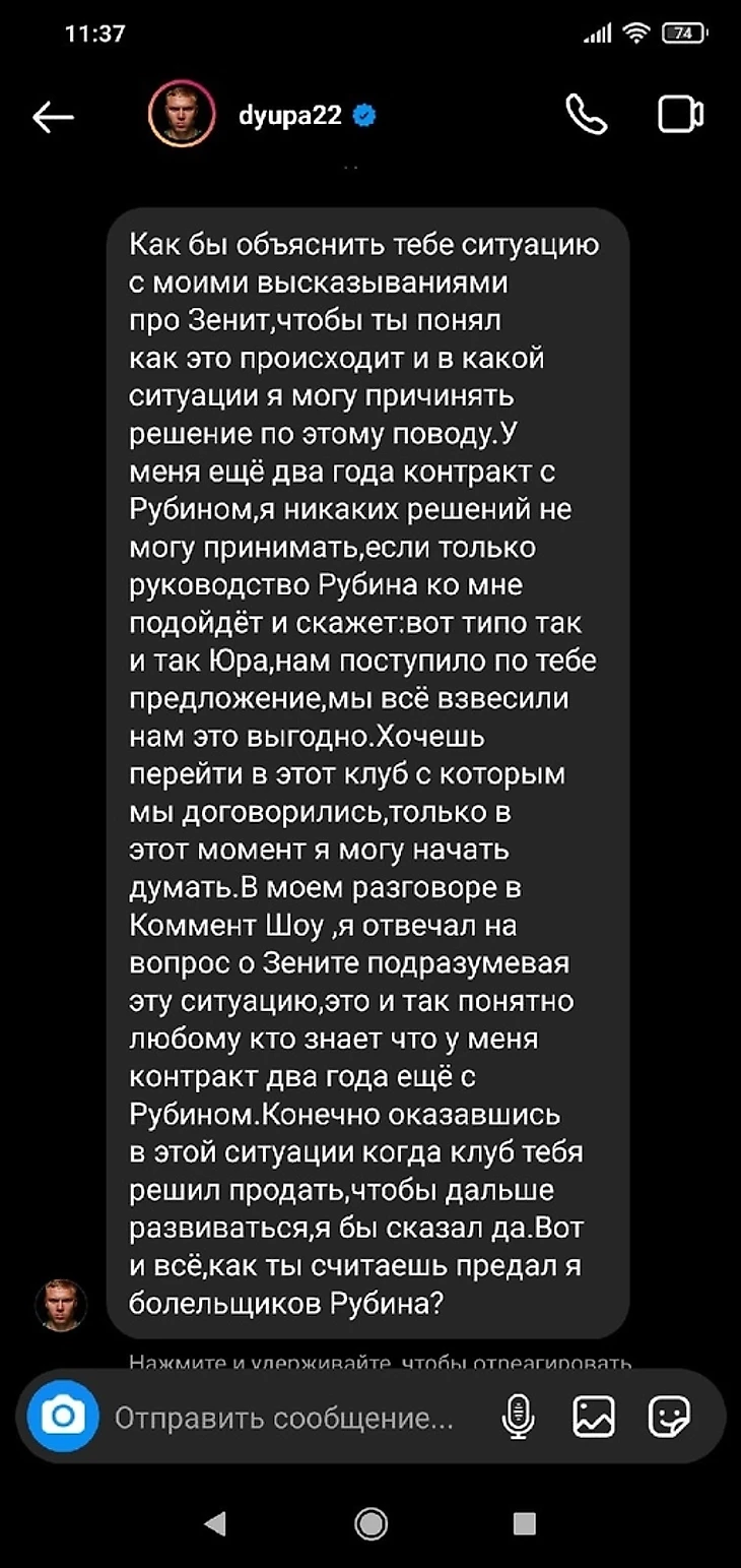 В Рубине всегда найдётся поддержка при удачных и неудачных матчах. Это краеугольный камень, с помощью него можно пережить и невзгоды, и праздники. Нужно высказываться более тактично, потому что все ценят верность и любовь. Посмотрите на Кейна! Ни один фанат шпор не скажет, что Харри предаёт команду своим желанием уйти. Да в том же Рубине игроки на продажу высказываются гораздо деликатнее. Как говорится: не пили сук, на котором сидишь. Так что признание Гилерме «вратарем номер один» - как щелчок по носу для Дюпина. Ведь он самоуверенно говорит от том, что лучший, а сегодня лучшим признают другого. Впрочем, у себя в Инстаграме Юрий свою позицию объяснил. Слово не воробей.