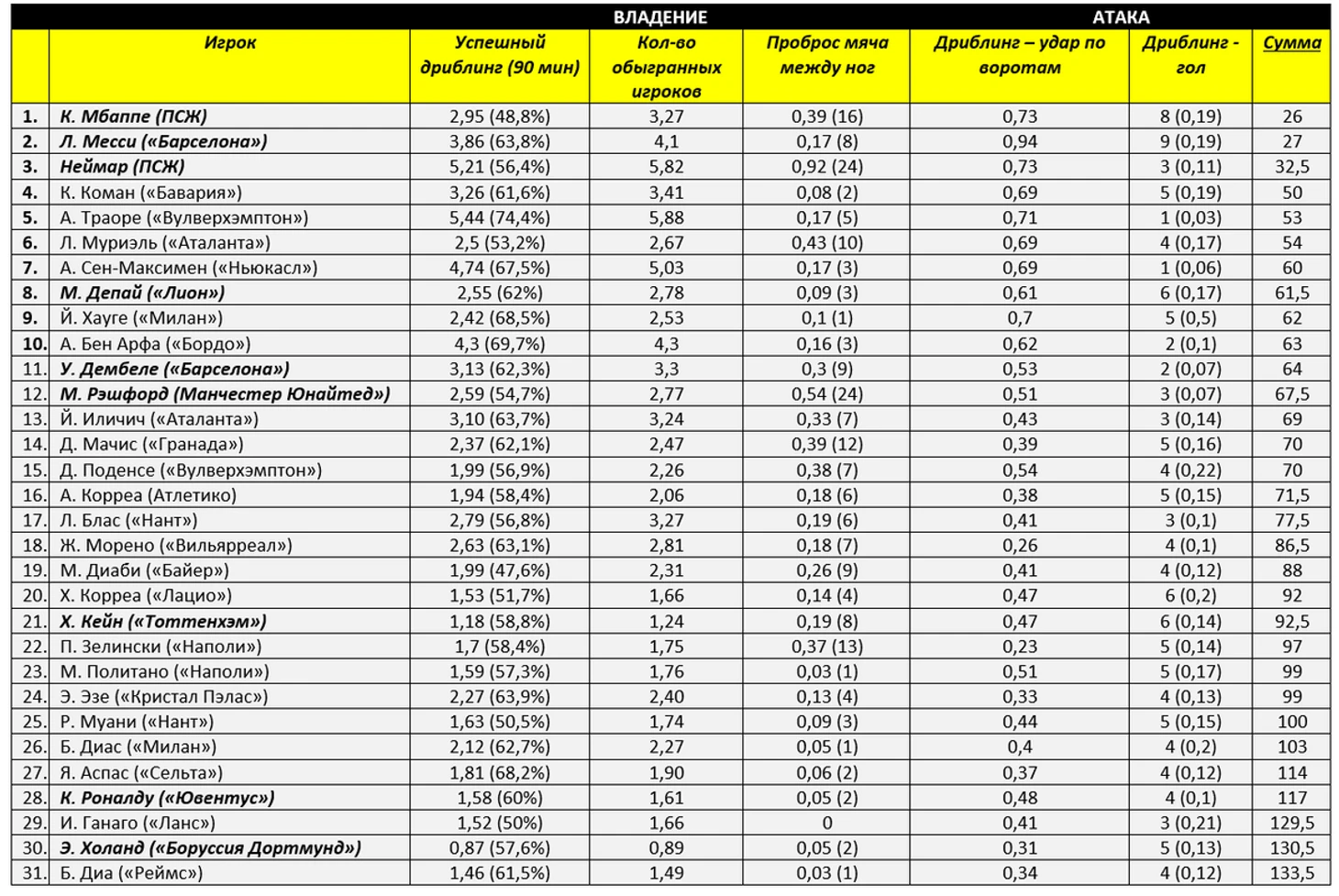 Статистика пересчитана на 90 минут игрового времени по всем клубным туринрам разом, а в случае с пробросом между ног и голами, как результатом дриблинга, ещё и указаны абсолютные числа. За исключение нескольких крайне крутых дриблёров (например, Траоре и Сен-Максимена), которых ну никак нельзя было не включить в этот рейтинг, был выставлен порог отбора в минимум 3 гола, забитых с дриблинга для дальнейшего анализа их скиллов. Минимальное количество матчей в пересчёте на 90 мин - 10 шт. Лучший тот, кто набрал меньше всего по сумме рангов за все 5 показателей.