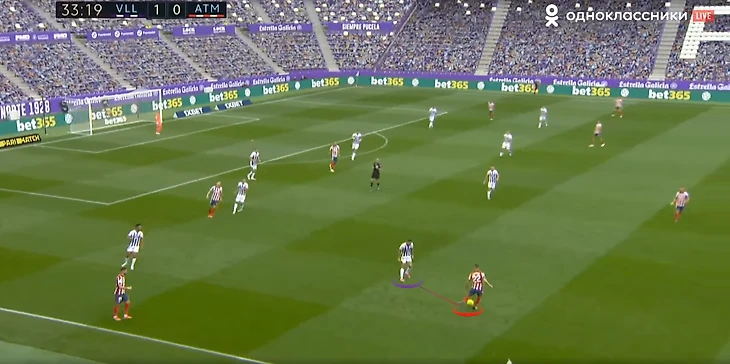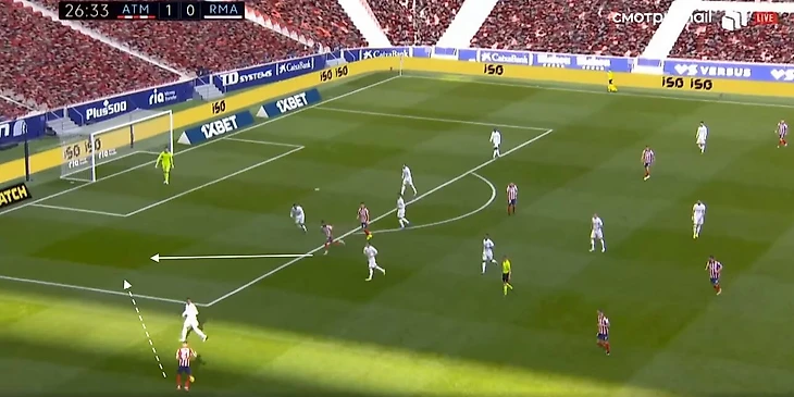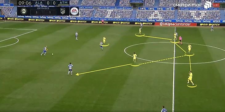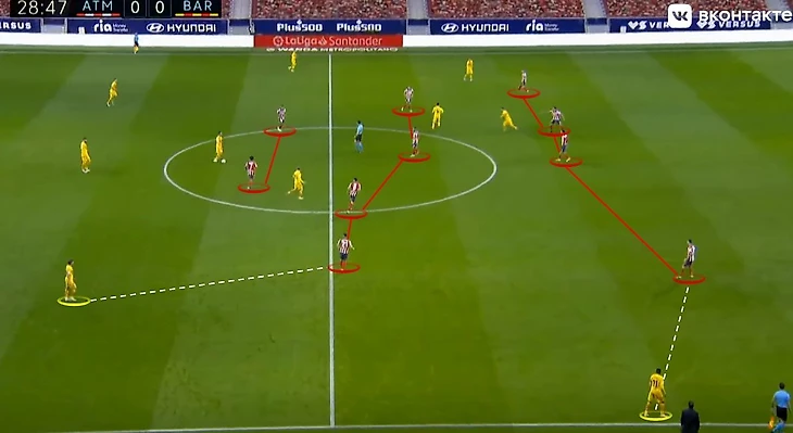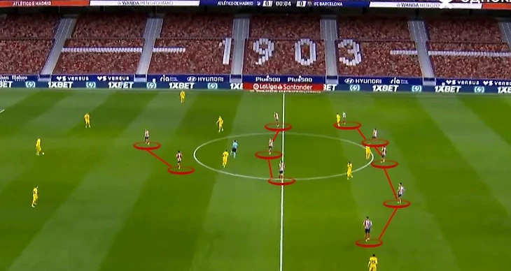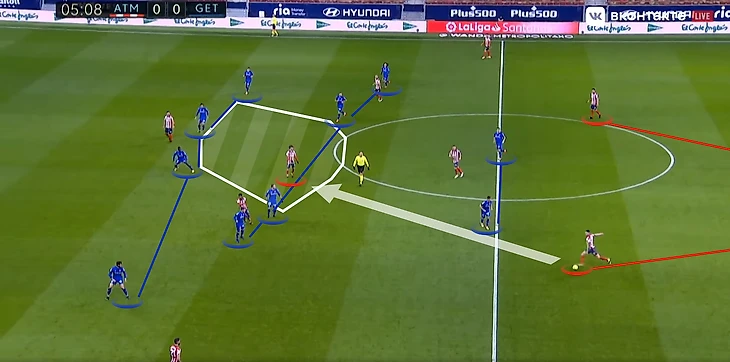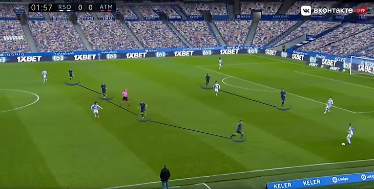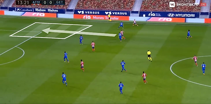 Ещё в прошлом сезоне Симеоне стал при низком блоке ситуативно переходить на пятёрку защитников за счёт опусканий дальнего от мяча вингера на одну линию с игроками обороны, сейчас этому нюансу стали уделять ещё больше внимания. Когда внизу пять игроков, а не четвёрка плюс страхующий, вертикальные каналы более узкие по умолчанию, игрок, которому потенциально вступать в отбор, уже повёрнут к воротам спиной, встречает соперника лицом. Кроме того, сам встречающий — центральный защитник — по идее в таких ситуациях (один в один против атакующего игрока внутри штрафной) должен разбираться получше, чем кто-то из четвёрки или пятёрки полузащитников.