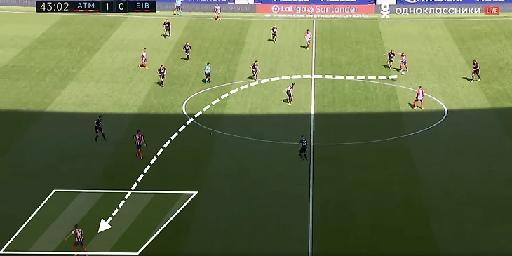 Другой вариант — ротация наполнения: под конец сезона достаточно часто в таких комбинациях стал участвовать Анхель Корреа, в то время как Льоренте нередко делал либо ложные рывки (освобождал Корреа для настоящих рывков), либо и вовсе находился в статичном положении.