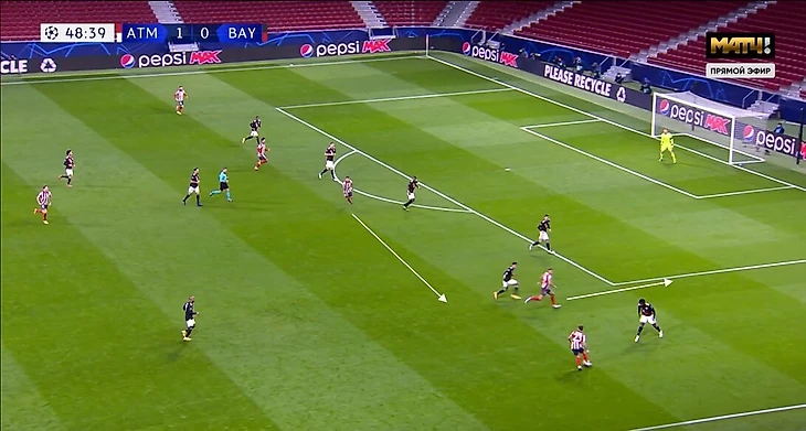 Практически всё рождалось из появлений Корреа справа. Самое первое, что придумали, — ложные открывания Льоренте. Мяч у Триппьера, и Маркос стартует в ту самую зону, уводя за собой игрока из центра поля. В этот момент из центра (против "Баварии" "Атлетико" играл с парой форвардов Корреа - Феликс) приходит Анхель Корреа — у аргентинца очень много пространства.