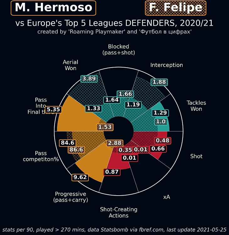 Зачем всё это нужно, наверняка понятно: максимизировать доставку мяча в штрафную при помощи прострелов низом/проникающих передач и минимизировать кроссы верхом. Появление Эрмосо при таком сценарии — шаг как раз в этом направлении: в плане игры в обороне он не всегда стабилен, многовато вступает в отборы, для него всё же требуется гибрид между ролью на фланге и в центре, но пасует лучше всех — это плюс и для структуры в целом в плане контроля территории (стало легче прижимать соперников, Суаресу сложно открываться под забросы за спину и участвовать в контратаках), и непосредственно с точки зрения продвижения мяча/обострения — в среднем на 90 минут Марио в чемпионате делает 0,87 SCA (действия, приведшие к удару), входит в 11% лучших игроков на своей позиции по этому показателю. С 5,13 передачами с продвижением на 90 минут он входит в 2% лучших центральных защитников чемпионата Испании.