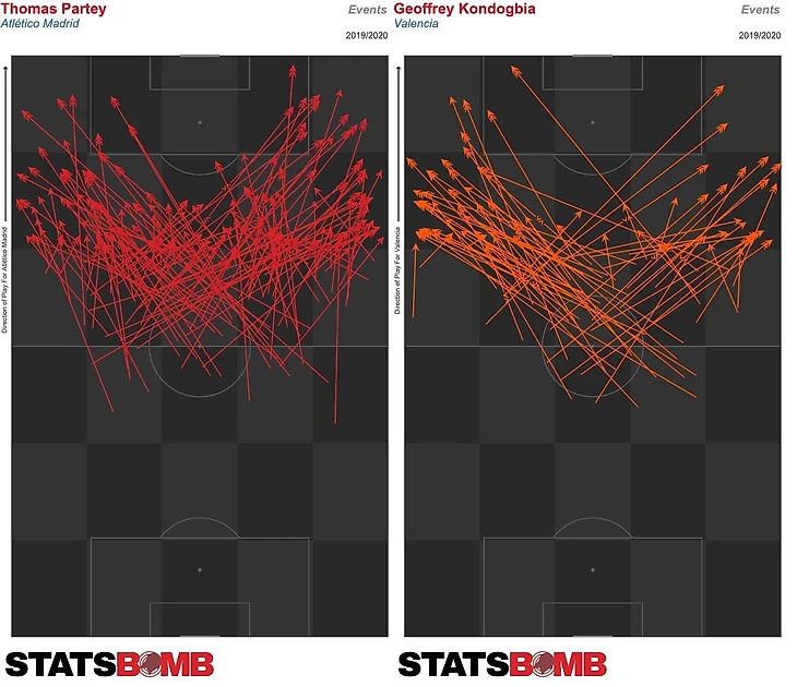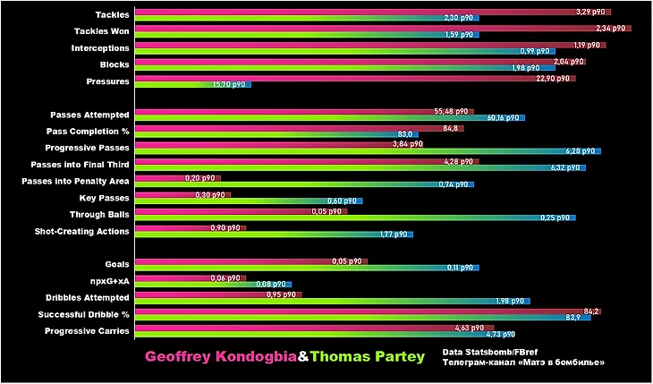 Парти чаще ищет обостряющие (более вертикальные варианты), у него хорошее первое касание, он неплохо продвигает мяч в стиле более классического опорника (через более горизонтальные варианты). У Кондогбиа в основном получается только сохранение мяча — чаще он ищет более безопасные варианты на фланге, похуже техника, меньше вовлечённость.