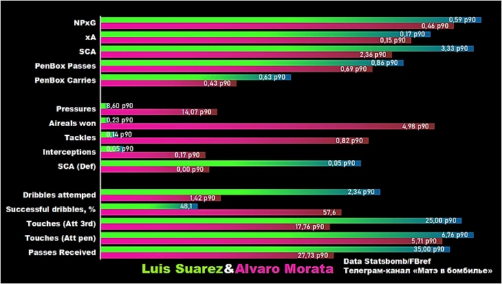 Как видно, Суарес очень хорош в завершении и игре в штрафной (хотя Мората катастрофически от него не отстаёт — тут ещё и разницу даёт более успешная игра "Барселоны" в созидании), в то время как действия в обороне у Луиса сильно провисают на фоне остальных форвардов. Для "Атлетико" традиционно очень большую роль играла готовность каждого игрока находиться за линией мяча и отрабатывать в обороне, но с Суаресом пришлось меняться — в большинстве матчей его необходимо разгружать от оборонительной работы.