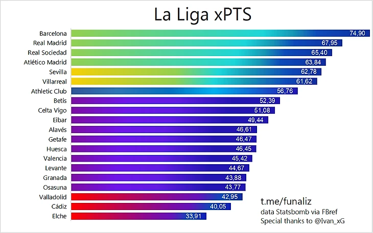 Ожидаемые очки прошедшего сезона Ла Лиги по данным от Statsbomb, за подсчёт спасибо Roaming playmaker