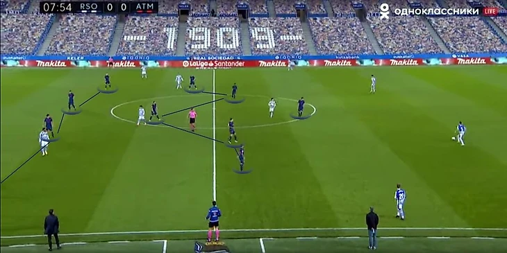 Со временем "Атлетико" отошёл от концепции игры с парой форвардов в пользу схемы с одним нападающим — достаточно грамотная реакция на возникшие неприятности: теперь вторая линия в низком блоке состоит не из трёх человек, а из четырёх — сложнее взломать низкий блок при помощи переводов с фланга на фланг.