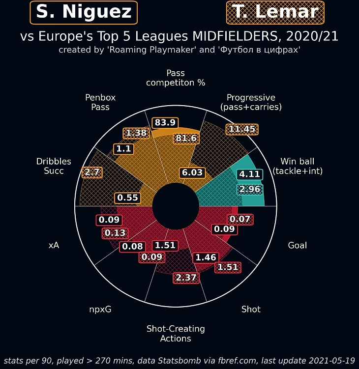 Появление Лемара в полузащите — это и огромный плюс для позиционных атак, потому что его прямой конкурент на эту позицию Сауль — скорее игрок баланса, более оборонительный вариант — видно, как он отстаёт практически по всем атакующим метрикам.
