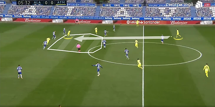 Билдап с ромбом внизу стал одной из главных тактических фишек 2020 года — первое время многие команды очень были очень плохо адаптированы к таким розыгрышам. Нередко соперники садились в пассивный средний/низкий блок, заботясь только о том, чтобы сковать опорника, в то время как крайний центральный защитник получал на мяче достаточно свободы и мог либо отдавать вразрез, либо переводить на другой фланг, где передачу ждал изолированный Триппьер (дальше вы знаете: 1-2 касания Кирана, передача в коридор на Льоренте).
