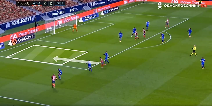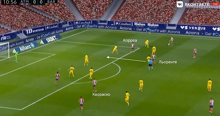 "Атлетико" пошёл по второму пути. Ближе к концу чемпионата всё чаще задействовали связку Карраско - Лемар при входе в штрафную, плюс разнообразили комбинации справа за счёт Корреа (в нужной зоне открывается он, а не Льоренте). При этом понятно, что такие шаги ведут к определённой потере качества: и Карраско, и Корреа и тем более Лемар в разной степени, но уступают Льоренте в резкости и умении поставить корпус — похоже этот приём Симеоне придумывал специально под Маркоса.