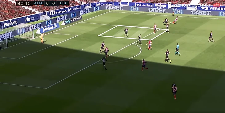 В эпизоде на иллюстрации "Эйбар" справляется с атакой за счёт низкого расположения Арбильи, который прочитал пас Триппьера и занял правильную позицию. Интересно, что конкретно здесь "Эйбар" не нагружает низ за счёт дополнительного игрока из полузащиты — даже с относительно широкими вертикальными каналами (так как внизу только четыре игрока, и один из них выдернулся на Триппьера) отоборонялся в конкретном эпизоде достаточно качественно.