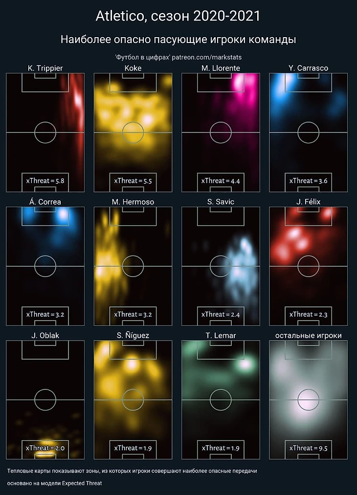 Лишнее подтверждение этой тенденции — тепловые карты xT игроков "Атлетико":