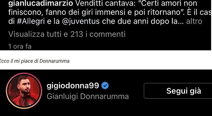 Доннарумма лайкнул в Instagram новость о возвращении Аллегри в «Ювентус». Голкипер уходит из «Милана» бесплатно и по слухам является важной целью для «Старой синьоры».