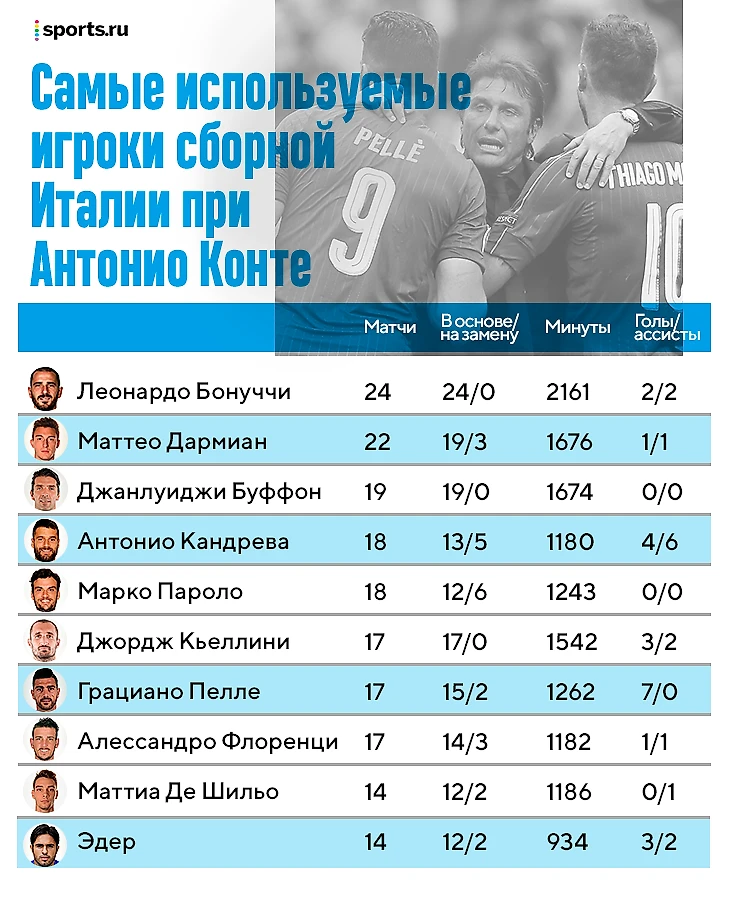 Конте возглавлял сборную с августа 2014-го по июль 2016 года. Италия под руководством Антонио сыграла 25 матчей, и только два игрока приняли участие как минимум в 20: Леонардо Бонуччи (24) и Маттео Дармиан (22). При этом до прихода Антонио у Дармиана было 4 матча за сборную (в мае-июне 2014-го), после его ухода – 10 (с ноября 2016-го по ноябрь 2017-го). Получив полную свободу действий в подборе футболистов, Конте много раз удивлял своими решениями. Например, основной парой нападающих на Евро-2016, где Италия вылетела в четвертьфинале от Германии, были Грациано Пелле и Эдер, которые дебютировали в сборной у Антонио, а после его ухода исчезли из национальной команды.