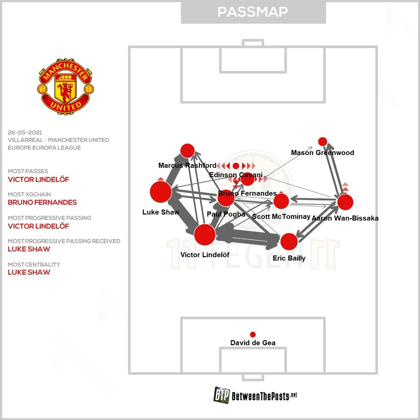 1) Тотальное преимущество левого фланга в интенсивности передач. Рэшфорд - Шоу - Виктор - Погба - Байи - таковая основная пасующая конструкция, остальные от мяча отрезаны. У вас ещё остались вопросы, зачем нам нужен профильный правый полузащитник на фланг? Отметим, что между Виктором - Скотти -Ван-Биссака, именно в таком порядке, очень слабое взаимодействие в передачах. Бруно Фернандеш и Кавани располагаются очень компактно. А Давид не участвует в данном случае в пасующей жизни команды 2) Больше всего передач - Виктор. Много передач Байи или Шоу, Погба. Если на француза то вариантов не было, его или сразу накрывают, либо снова отдать Люку или пас на Скотти, который не самый активный дирижёр и связующее звено, при всех его сильных сторонах . Испанцы отрезали полностью наших атакующих игроков. Не хватало скорости, резкости и забеганий в высвобождающиеся зоны. 3) xGChain - это совокупность таких вещей, как xG (ожидаемые голы) + xA (ожидаемые ассисты) + xGBuildup (процесс построения атак на первых фазах, организуется выход в чужую треть поля). Тут лучший Бруно. Конечно это сильный игрок, но когда впереди все перекрыты...да. Ещё, когда играет Скотти, да и нету Магуайре, приходится глубже опускаться самому за мячом. Порой выпадение оборонительной, но важной единицы, которая может продвигать мяч вперед, сказывается сильно и на атаке. 4) Progressive passes – передача, продвигающая атаку минимум на 10 ярдов к чужим воротам (либо пас в штрафную). Тут выделяется Виктор. И это снова показатель нашего левого фланга, где проводит прекрасный сезон Люк, а Рэшфорд вчера просто упирался в каждого, как в стену. Ну и передачи шведа на Погба. 5) Progressive passing received - на кого шло большее количество передач, которые привели к продвижению атак. Жаль, что у нас нет такой опции на правом фланге, которая может ТАК ЖЕ продвигать атаки к воротам соперника. Это не камень в сторону Ван-Биссаки, так как по карте видно, что игрок ходил вперёд, но кто там его ждёт? Гринвуд. Не стоит вешать на ещё молодого парня ответственность в решении этих задач в финале. Это факт того, что у нас нет нужных деталей на правом фланге, для борьбы в разных ситуациях против парковки среднего и низкого блока. Нет атакующего правого заща и правого флангового полузащитника....жаль. 6) Большая центральность - Люк Шоу. Центральность - Показатель центральности или близости к центру в теории графов и анализе сетей определяет наиболее важные вершины графа. Приложения показателя применяются для выявления наиболее влиятельного лица (лиц) в социальной сети, ключевых узлов инфраструктуры в интернете или городских сетей и разносчиков болезни. Концепции центральности первоначально развивались в анализе социальных сетей и многие термины центральности используются для измерения социологических первоисточников. Не следует путать эти показатели с метриками влияния узлов, которые ищут количественные характеристики влияния каждого узла в сети. Т.е. данный показатель уверяет нас в том, что Шоу, в данном матче - это была матрица, связующее звено. Чувствуется перегруз левого фланга и полуфланга. Твой соперник уже понимает, где ему стоит обороняться тщательнее и кого накрывать персонально...такое мы уже видим последние лет 8.