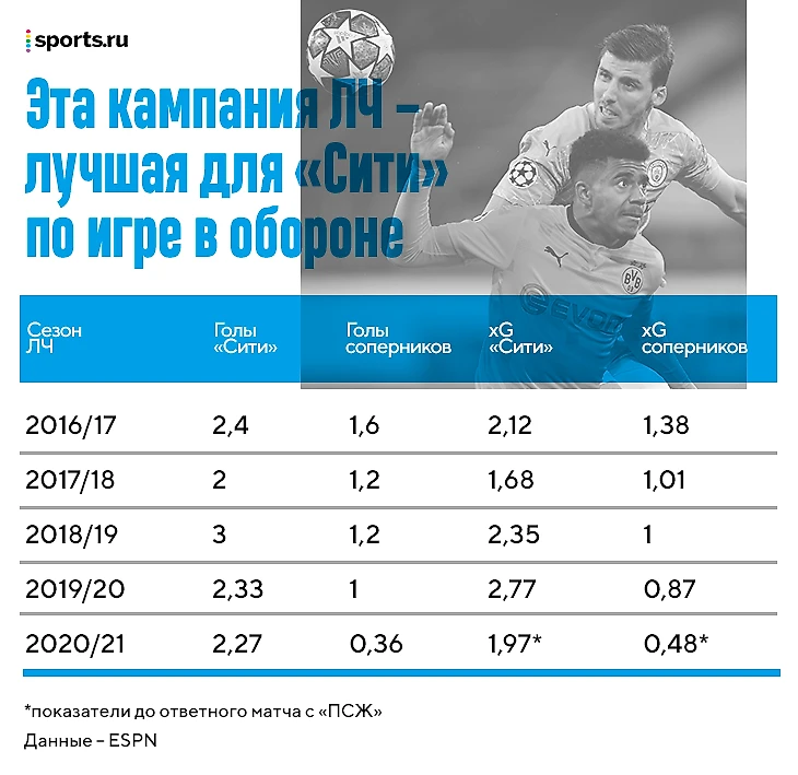 Итог – исключительный сезон по игре в обороне. У «Сити» лучший при Пепе показатель по пропущенным мячам в ЛЧ за игру. То же самое – с ожидаемыми голами соперника. По обоим параметрам «Сити» прибавил примерно в два раза по сравнению с предыдущим рекордом – существенный и очень важный прирост, учитывая, что команда еще ни разу не забивала в плей-офф 3 и более голов.