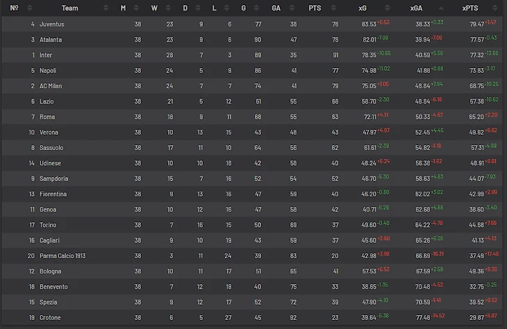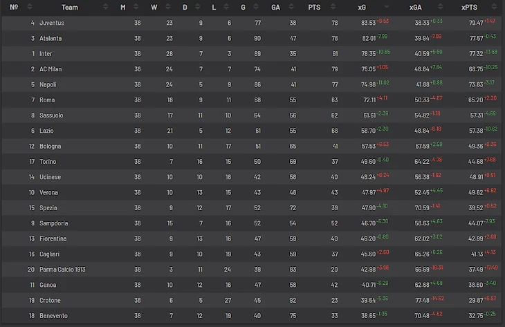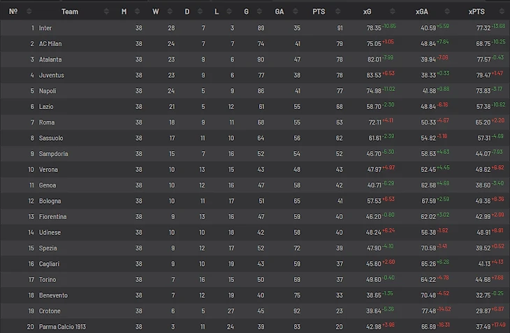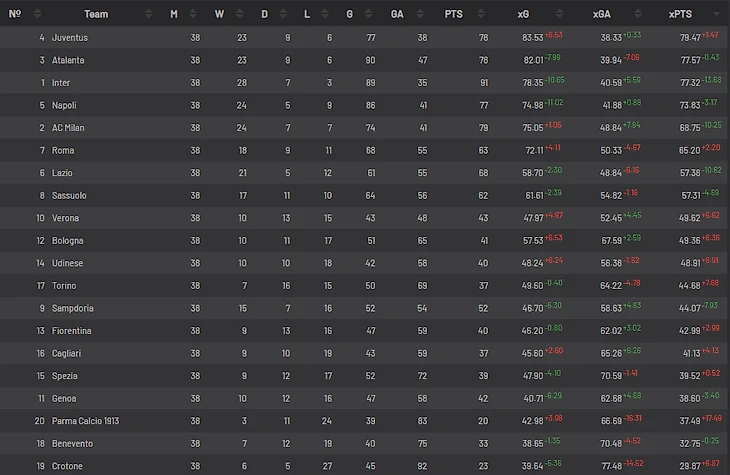 Система подсчета ожидаемых очков считает, что “Юве” должен остаться гегемоном в Италии, опережая “Аталанту” и “Интер” на 2 очка соответственно. У “нерадзурри” перебор аж на 13,68 баллов, что позволяет иметь тот самый 13-очковый отрыв в реальности. Также высоко прыгнули “Милан” и “Лацио”, набрав на 10+ баллов больше. Хотя в Лигу Чемпионов по xPTS попадает именно “Наполи”, а не “россонери”, опережая миланцев на 5 пунктов. Самый большой недобор у “Пармы” -17,49, которая все равно осталась в зоне вылета.