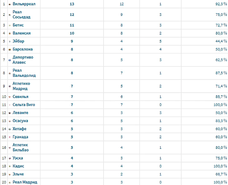 Здесь особое внимание вызывает лидерство “Барселоны” с отрывом в 8,2 очка от второго мадридского “Реала”, “Атлетико” же и вовсе вне зоны Лиги чемпионов. Каталонцы по факту набрали столько же очков, насколько и наиграли, а вот конкуренты из Мадрида перебрали на 14 и 20 очков соответственно. В тройке лидеров “Реал Сосьедад”, но баски недобрали 5,61 баллов. Самый значительный “недобор” у “Эйбара” – 18,62, который в итоге оказался последним.