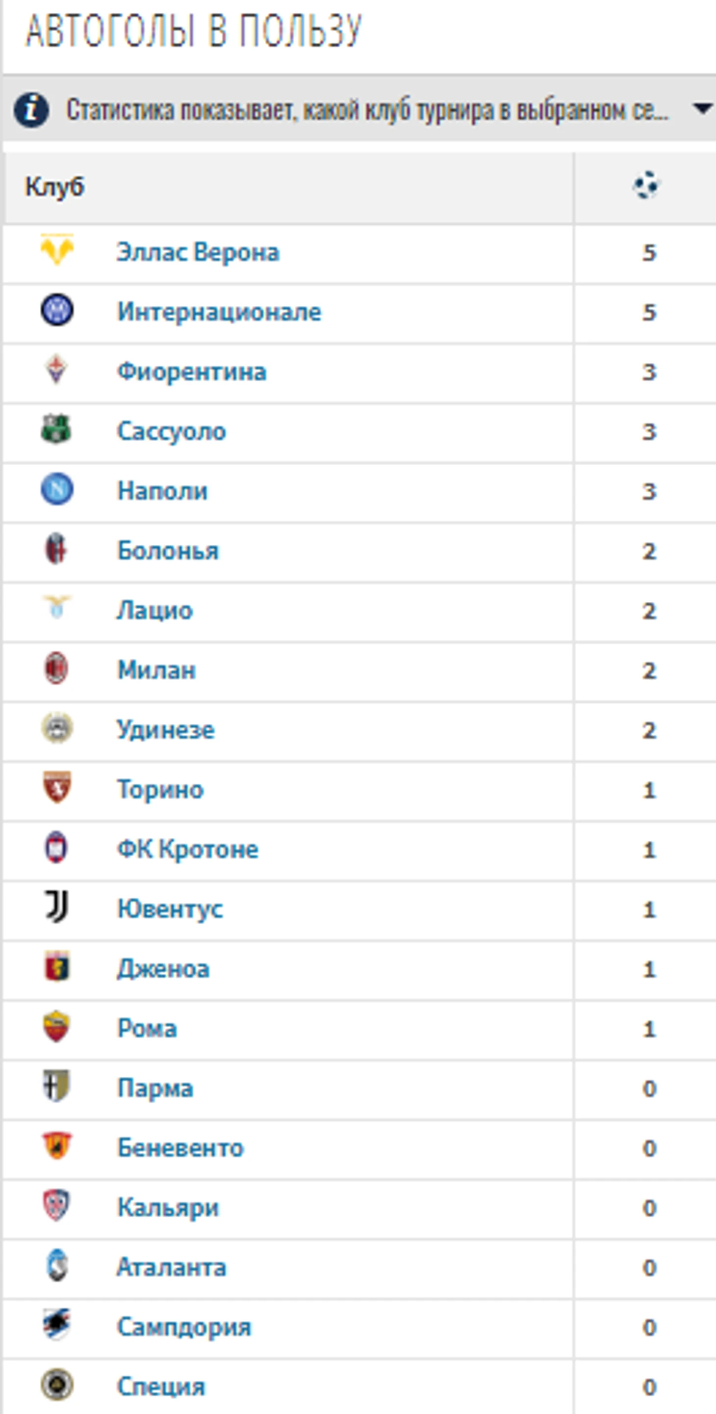 По полученным автоголам впереди всех находятся “Верона” и “Интер” по 5 мячей.