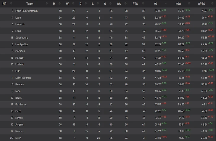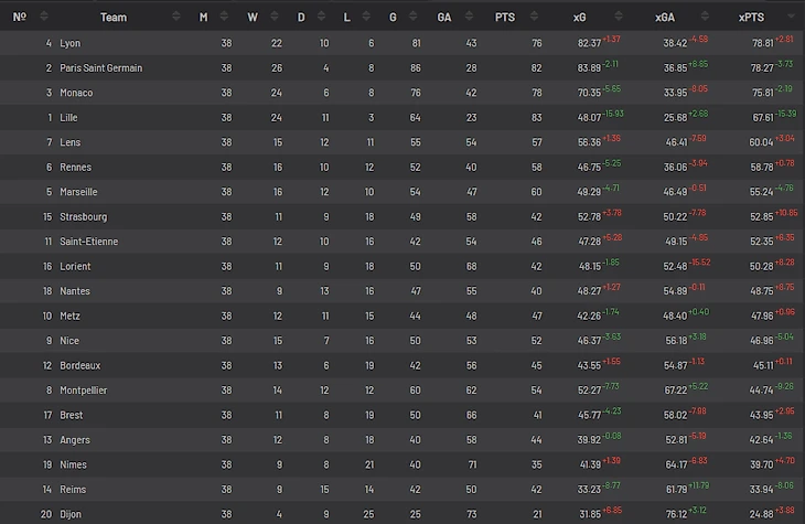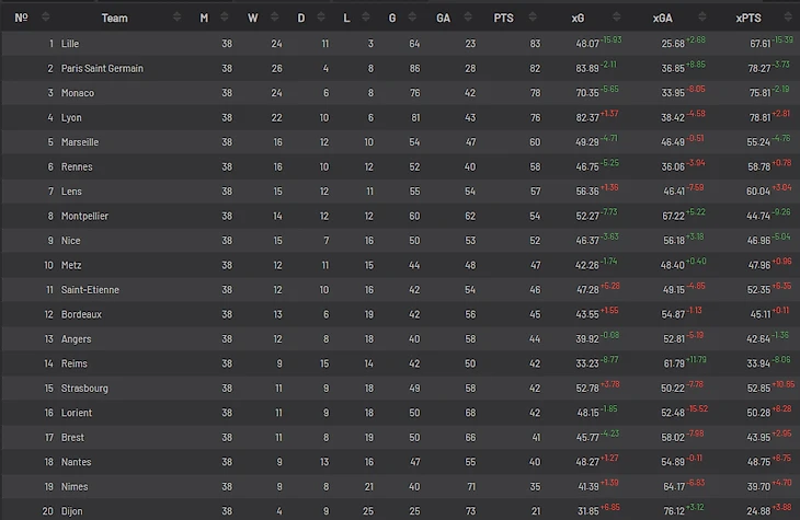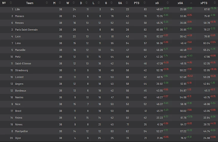 По показателю xG ожидаемо в лидерах ПСЖ, чуть позади “Лион”. А вот “Монако” Головина отстает от лидера на 13,5 пунктов. “Лилль” и вовсе 10-й (!!!), но показал лучшую разность на 15,93. Хуже всех по xG и его разнице оказался “Дижон”, за что поплатился последним местом в таблице.