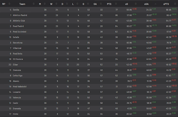 По допущенным голам неожиданно в лидерстве “Севилья”, которая ненамного опередила “Атлетико” (34,33 против 35,67). Лучшая разница у мадридского “Реала” – команда пропустила на 10,7 голов меньше, чем ожидалось. Почти столько же и у “матрасников” – 10,67. За это отдельное спасибо Куртуа и Облаку. Худшая разность у “Сельты” – 6,69.