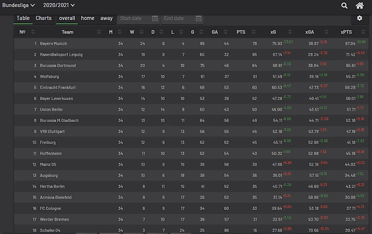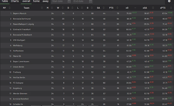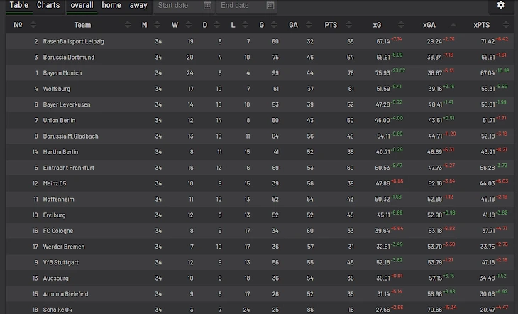 Глобальных аномалий, кроме кейса “Баварии”, в Бундеслиге особо замечено не было. Пожалуй, еще можно отметить прыжок “Вольфсбурга” на 5,69 по xPTS, который позволил “волкам” опередить “Айнтрахт” в борьбе за 4-ую лигочемпионскую путевку. В остальном все находятся на своих местах (+/-). Но пример мюнхенцев доказывает, что продвинутая статистика требует еще более точной интеграции факторов для ее бОльшей связи с реальным положением дел.