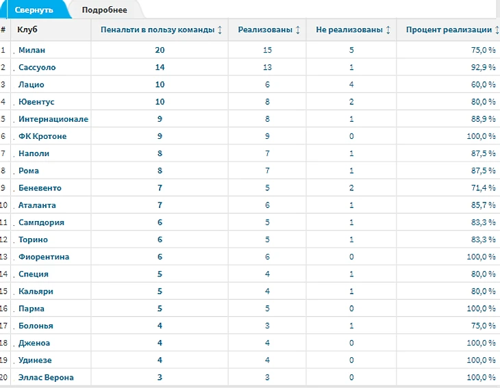 Какой-то сумасшедший перевес по количеству пробитых пенальти наблюдается у “россонери”. Так много не пробила с “точки” ни одна команда в топ-5 лигах (20 раз!!!). Реализация 15 из них позволила “красно-черным” обойти в 2-2,5 раза оставшихся позади “Ювентус”, “Наполи” и “Аталанту” (8, 7 и 6 голов соответственно).