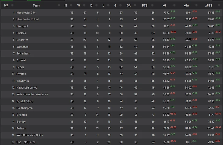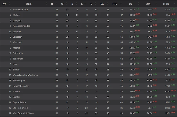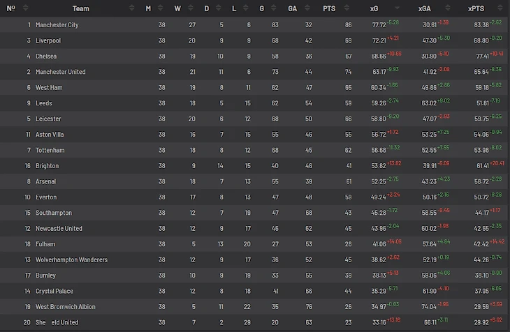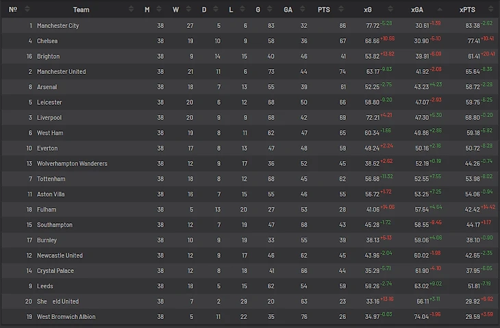 По ожидаемым очкам вся “лигочемпионская четверка” тождественна реальному положению дел, только разнится ее порядок. Впереди ожидаемо “Сити”, а вот вторые уже “Челси”, которые недобрали 10,41 балла. “Мерсисайдцы” остаются на 3-й строчке, опережая заклятых соперников из “красного” Манчестера на 3 очка, но “манкуниацы” перебрали поинтов аж на 8,36, поэтому и финишировали следующими за чемпионами. Дико не повезло “Брайтону” – подопечные Грэма Поттера забрали на 20,41 меньше ожидаемого и заняли 16-ую позицию вместо 5-ой. Также не фартануло “Фулхэму”, будь лондонцы более удачливыми, то точно бы остались в премьер-лиге, а так -14,42 и здравствуй Чемпионшип.