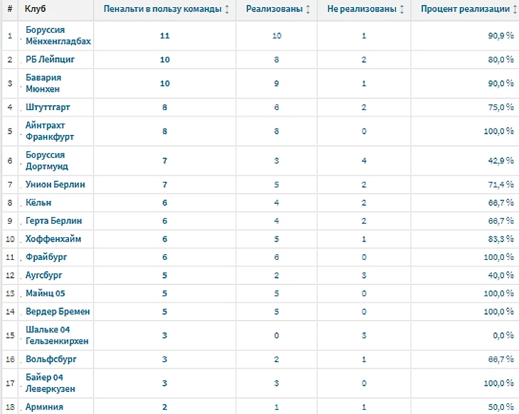 Подопечные Нико Ковача во главе таблицы с 15 одиннадцатиметровыми за сезон. “Лилль” делит 14-ую строчку с 5 ударами.