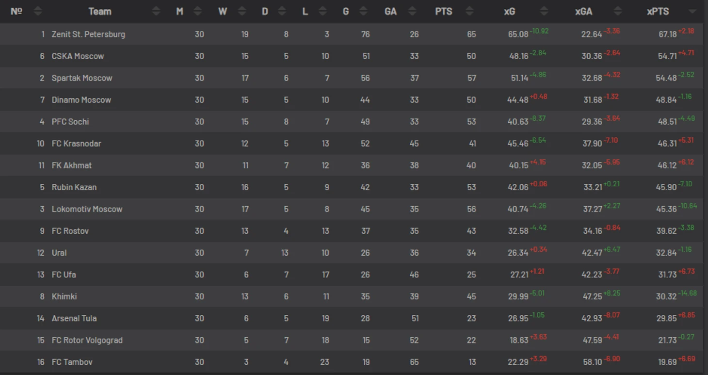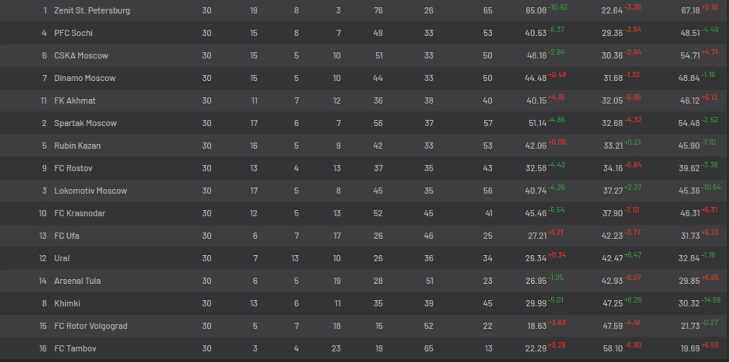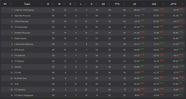 “Зенит” снова на вершине, обходя аж на 14 баллов второй “Спартак” и показывая лучшую разность по xG +10,92. “Армейцы” в тройке, “Локо” только 7-ой. Обращает на себя 4-ая строчка “Краснодара”. Худшая разность у “Ахмата” -4,15.