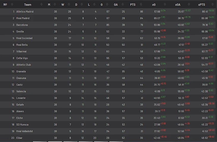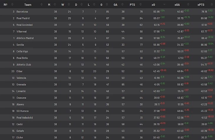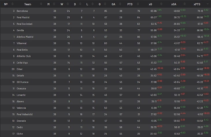 По xG также впереди “Барса” с большим отрывом в почти +19 над все тем же “Реалом”, “Атлетико” же снова 5-й, но “матрасники” забили на 9,34 гола больше своих ожидаемых мячей (лучшая разница во всей лиге). Худшая разница у “Эйбара” – 13,45.