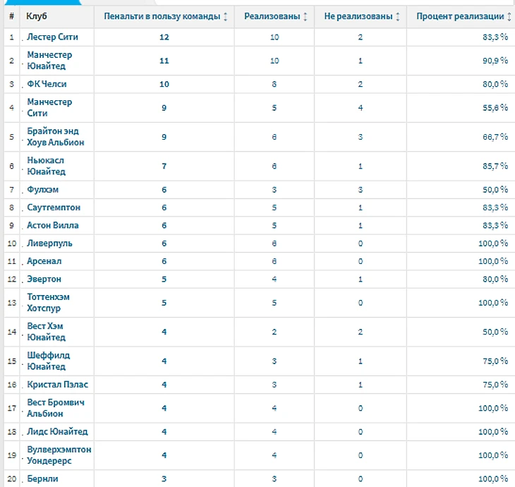 Тройка лидеров-пенальтистов: “Лестер”, “МЮ”, “Челси” (12,11,10 ударов соответственно). Со знаком “-“ снова выделился “Фулхэм”, который забил лишь 50% своих “точек” (3 из 6). Чуть лучше положение у “Брайтона” – 66,7% (6 из 9), но тоже не ахти.