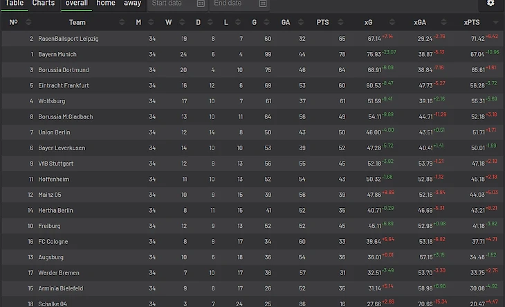 Наверное, минувший сезон Бундеслиги лучше всего вскроет недостаток показателя xPTS. По ожидаемым очкам “чемпионом” стал “РБ Лейпциг” (71,42 против 67,04 у “Баварии”). Это стало возможным благодаря корреляции xG и xGA. Более подробно об этом напишу ниже. Но всем адекватным болельщикам понятно, что мюнхенцы были на голову сильнее “быков” на дистанции.