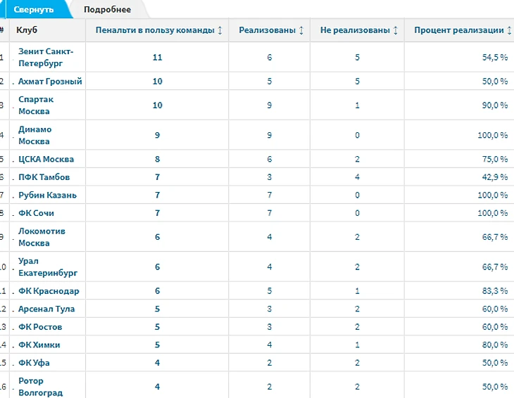 У “Зенита” 11 пробитых пенальти за чемпионат, но только 6 были реализованы (вспоминаются промахи с “точек” Азмуна и Дзюбы). На один удар позади “Ахмат” и “Спартак”, правда у грозненцев при этом просто ужасная конверсия – всего 50%. Хуже бил только “Тамбов” – 42,9%.