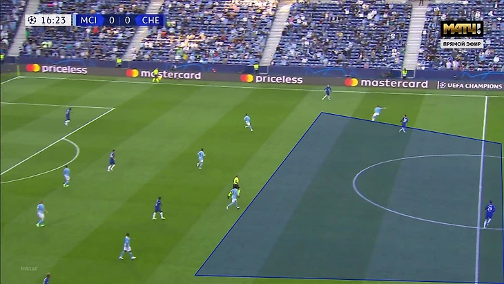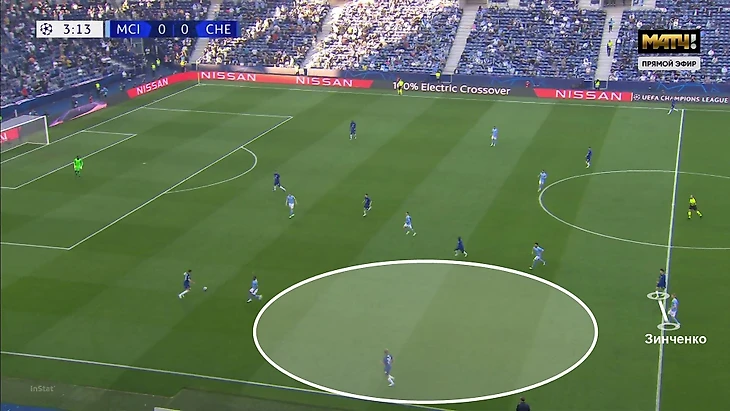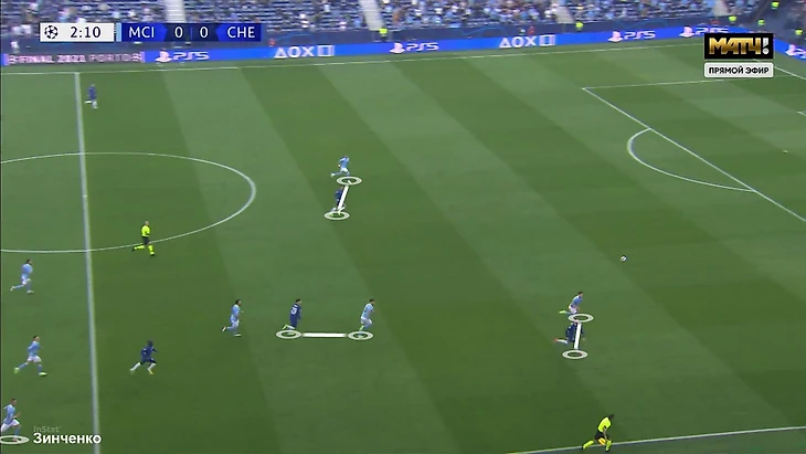 При четверке открываться за спину и отдавать такие пасы чуть проще. То есть в этом эпизоде проблемы «Челси» начались именно с попытки отреагировать на перегруз «Сити» в полузащите.